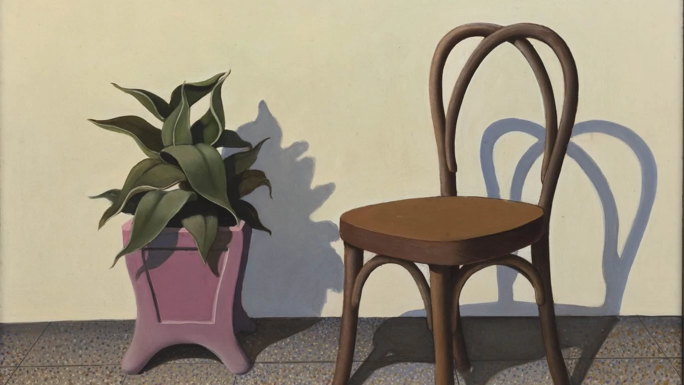 En Patio priman los tonos violáceos y rosados (tirando al celeste) y una mezcla brumosa tendiente a experimentar con la combinatoria de colores. Las sombras –más la de la silla que la de las hojas– proyectadas en la pared, cobran una corporeidad maciza, espesa, produciendo una inversión extraña en la superficie pictórica: el objeto real parece imitación de la sombra.