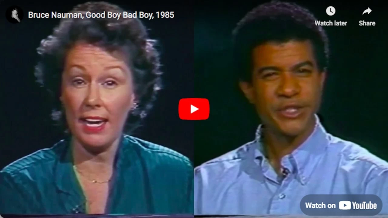 Figura clave en el videoarte experimental de finales de los sesenta, esta obra presenta a dos actores en primer plano repitiendo cien frases que generan una confrontación directa con el espectador.