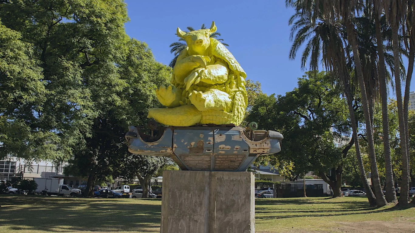 Justo frente al lago de los flamencos, sobre la calle República de la India, un tatú carreta completamente amarillo está sentado sobre un auto dado vuelta, lleno de ladrillos. El animal, en pose zen, parece tener el control de la situación y observa el panorama desde las alturas, con gesto sabio. Se trata de Hito de frontera, una escultura del artista visual y escritor Carlos Huffmann, que se mudó hace poco de la Plaza Intendente Seeber, ubicada al otro lado de la Avenida Sarmiento, para encontrarse en un nuevo contexto rodeada de naturaleza en el Ecoparque, donde antes funcionaba el Zoológico de Buenos Aires.