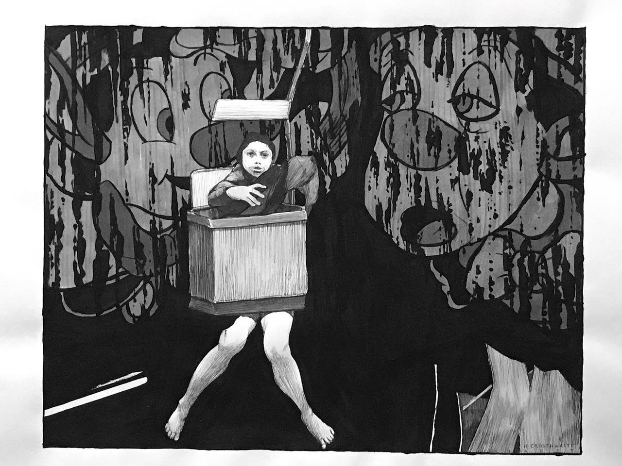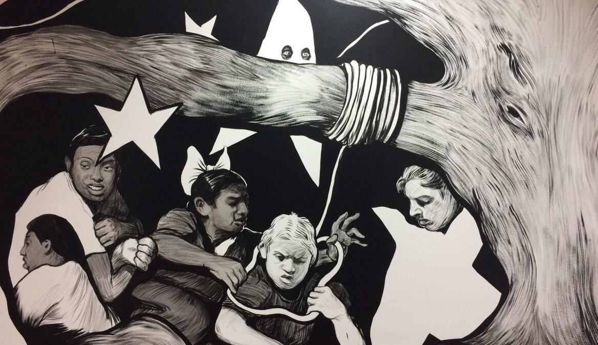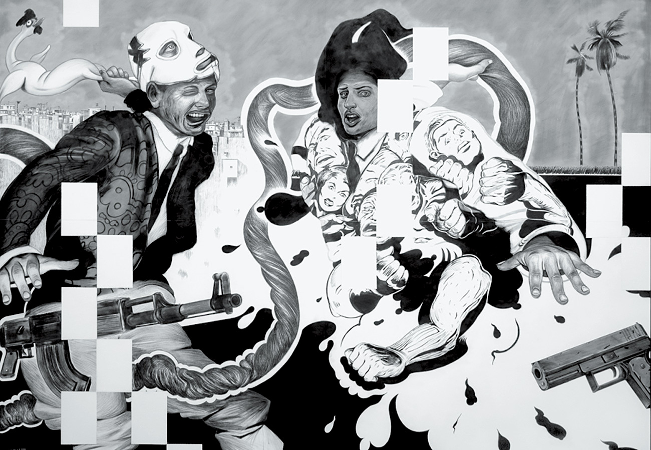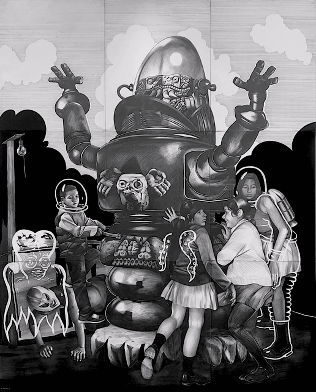 En la pintura mural The line (un esfuerzo descomunal de ocho metros cuadrados), Hugo Crosthwaite (Tijuana, 1971) termina por fundir dos tradiciones bien enraizadas en la cultura visual mexicana. El muralismo, como entrevero entre la revolución y la modernidad, y los exvotos, como gesto artesanal de devoción heredado de la espiritualidad ibérica trasplantada y remixada durante el largo proceso de colonización e independencia de América.