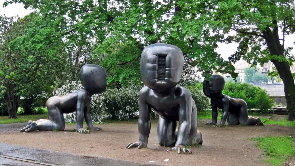 Reclamos, conmemoraciones, metáforas y denuncias se traslucen entre las obras emplazadas en este oasis verde. Los Bebés del escandaloso escultor checo David Černý, son la joyita de Kampa. Tres niños gigantes (3,5 metros de alto) en bronce, gateando sobre el pasto. Bebés, que con su cuerpo redondeado desde lejos inspiran ternura, pero al acercarse se descubre un elemento que los distorsiona y afecta la experiencia: no tienen cara, en su lugar, aparece un código de barras. Černý es conocido por sus provocadoras creaciones y por transformar su tradicional ciudad natal en el escenario surrealista perfecto para preguntas difíciles e incómodas. En este caso, los miedos asociados al crecimiento desproporcionado de la tecnología y sus alcances. ¿Hasta dónde llegaremos? “Recordemos que los bebés pueden ser pequeños ángeles de destrucción. No conocen las reglas, hasta podrían matar a alguien”, se cuestiona el artista.